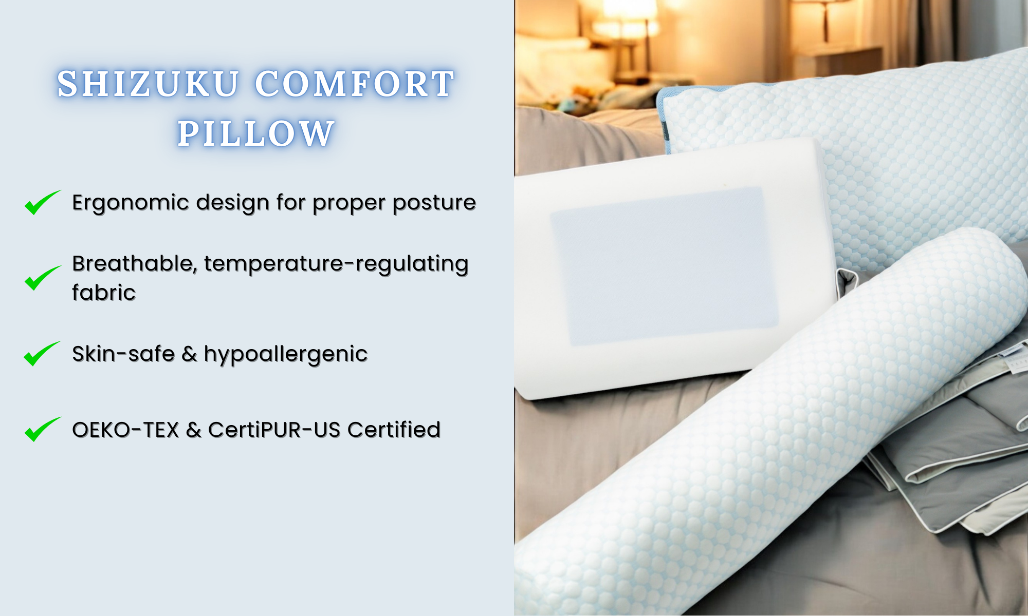 At Shizuku Comfort, we believe better sleep and daily wellness should feel gentle, safe, and tailored just for you. That’s why we design cooling, breathable pillows and personalized aromatherapy — all certified for your peace of mind.
