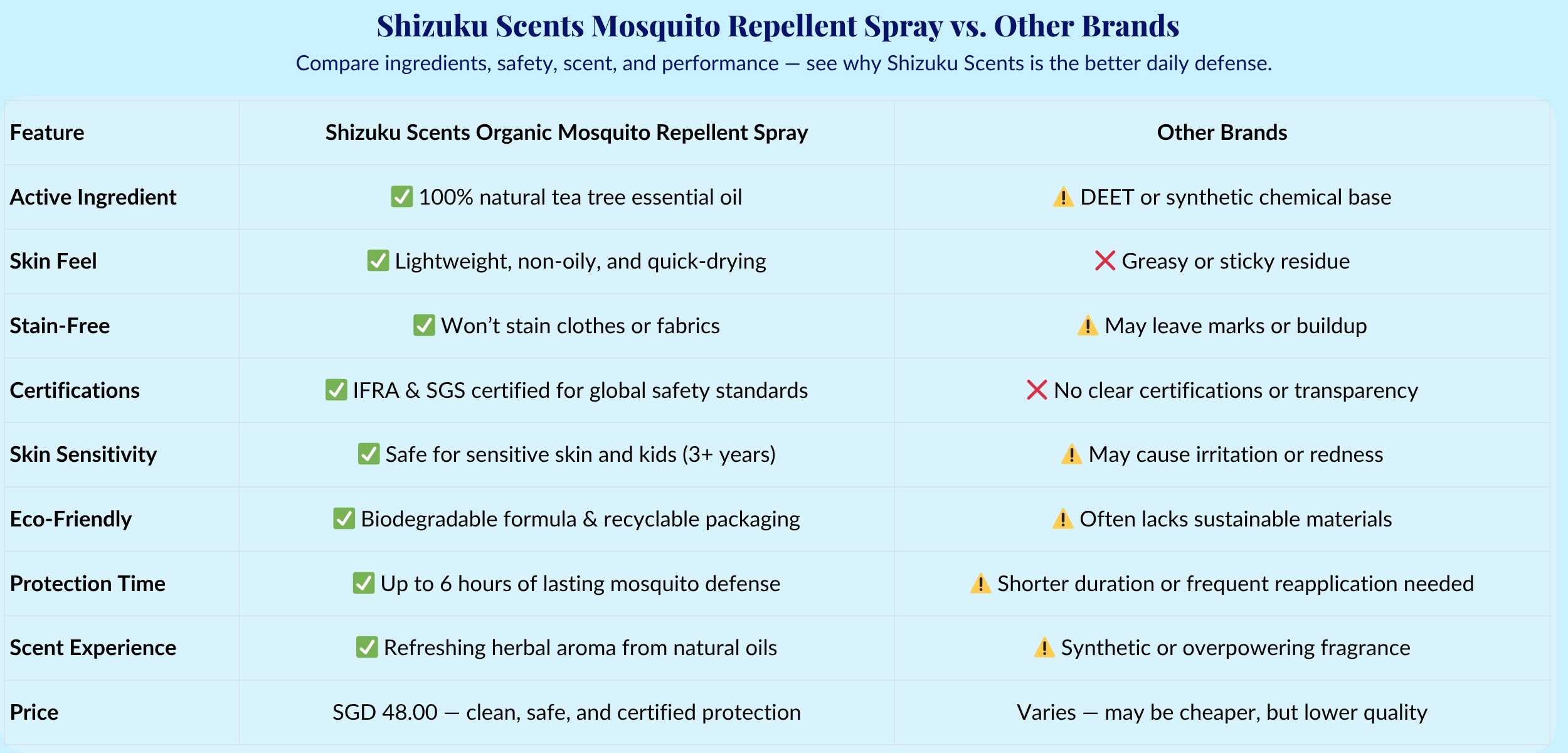 🌿 Organic Tea Tree Oil | 🛡 Long-Lasting Mosquito Defense | 💧 Water-Based & Fast-Drying | 👶 Kid-Safe (3+) & Gentle | ♻️ Planet-Loving Formula | 🔬 IFRA & SGS Certified